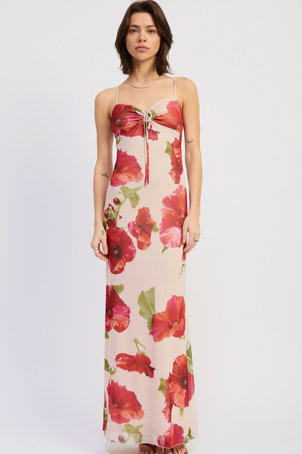 Penny Halter Cross Back Maxi Dress in floral cream and red. Model wears size small and stands 5'9". This elegant maxi dress features a flattering halter neckline and cross back design for a sophisticated silhouette. Perfect for special occasions, garden parties, or elevated everyday wear. The flowing fabric drapes beautifully while the structured halter provides comfortable support.