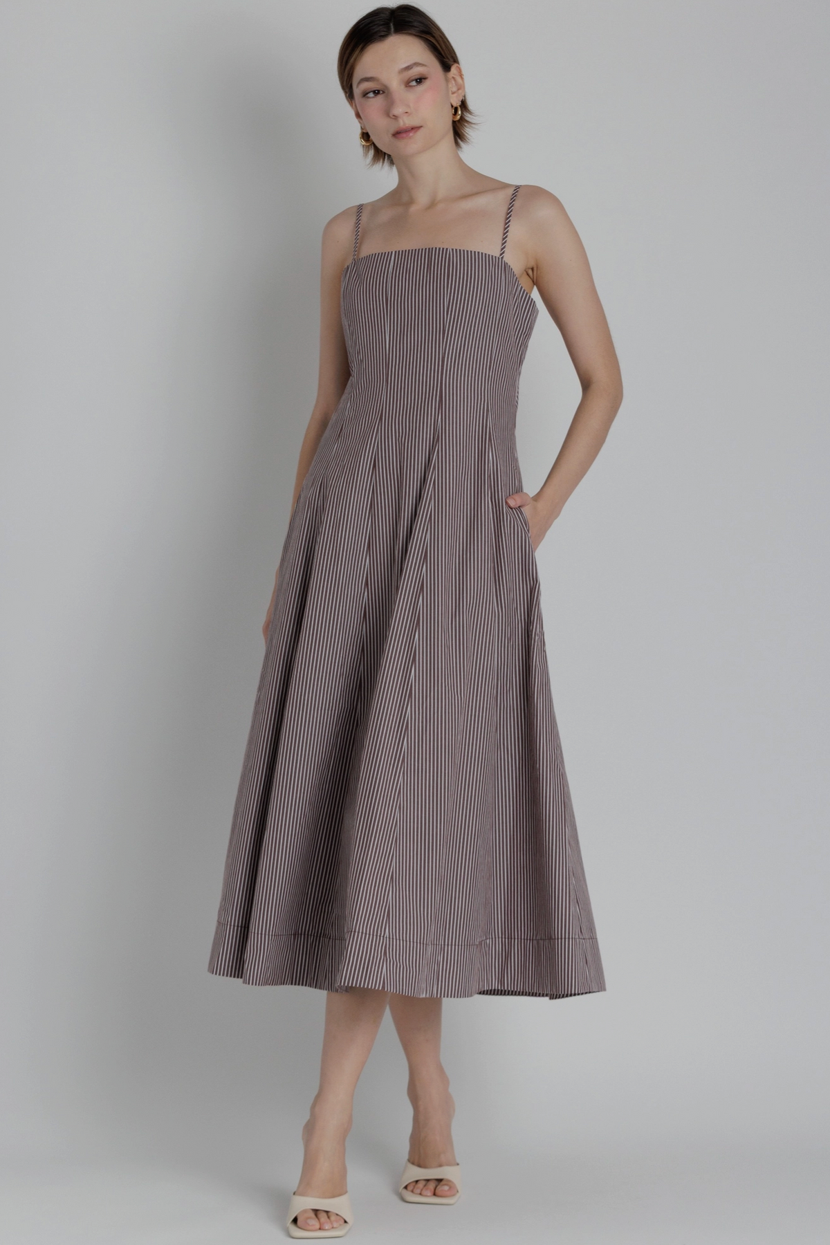 Elevate your everyday style with the Charlie Striped Midi Dress—a playful take on a timeless classic. This charming piece features crisp white vertical stripes dancing across a rich brown base, creating a flattering silhouette that elongates your frame. Perfect for brunch dates, casual outings, or effortless weekend wear, the midi length offers just the right amount of sophistication. Pair it with sneakers for laid-back vibes or dress it up with heels for an instant polish. A wardrobe essential that proves stripes never go out of style.