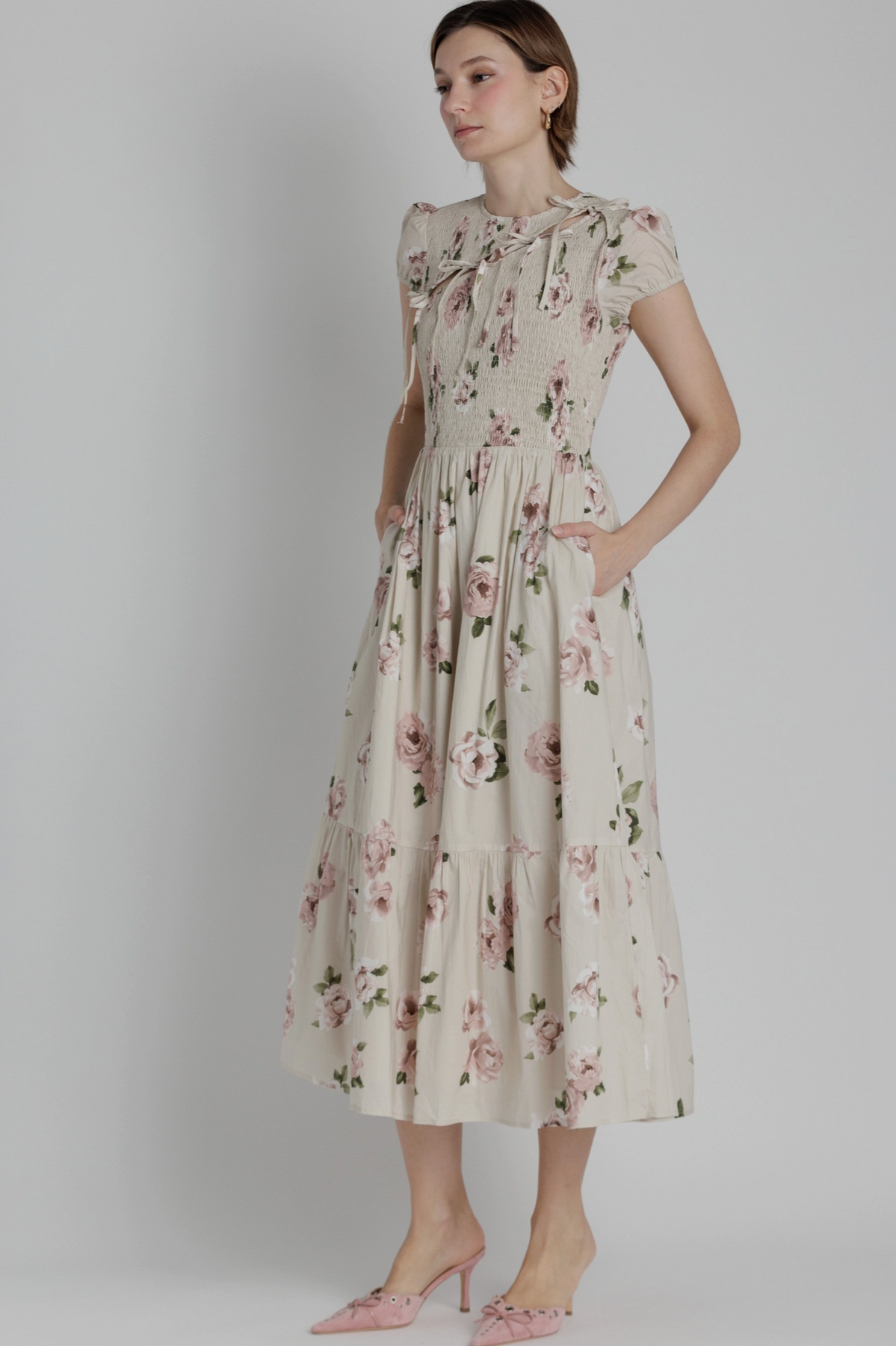 Meet your new favorite dress! This cream midi features a gorgeous floral pattern that dances across the fabric, while the smocked top hugs you in all the right ways. Short sleeves keep it breezy and comfortable, and the decorative ties across the chest add a flirty, feminine touch that's totally Instagram-worthy. Whether you're heading to a garden party or a casual weekend adventure, this dress delivers effortless style with a playful edge.