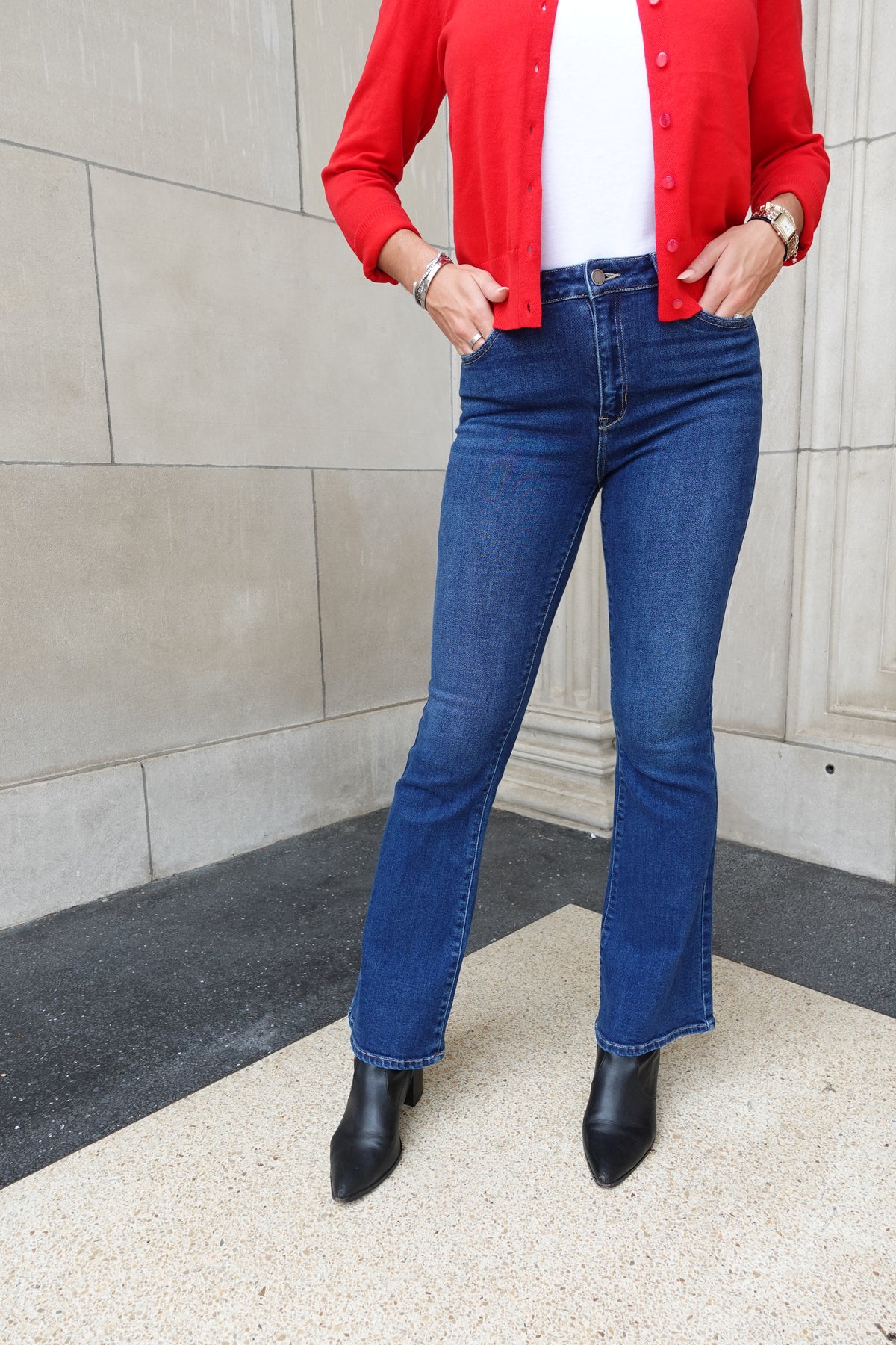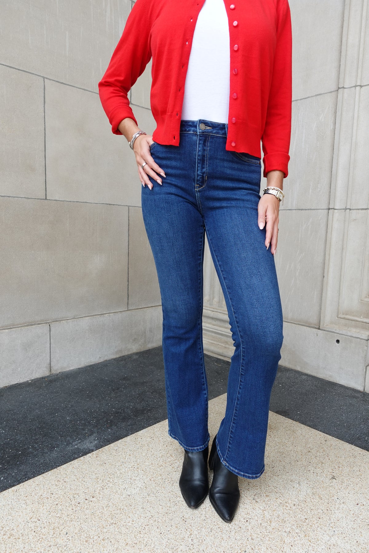 Step into style with the Mid Rise Flare Jean in a rich dark wash. Crafted from 100% cotton, these jeans offer a comfy fit that’s just right for dressing up or down. The flattering mid rise and playful flare leg add a fun twist to your wardrobe, making every outfit feel effortlessly chic.