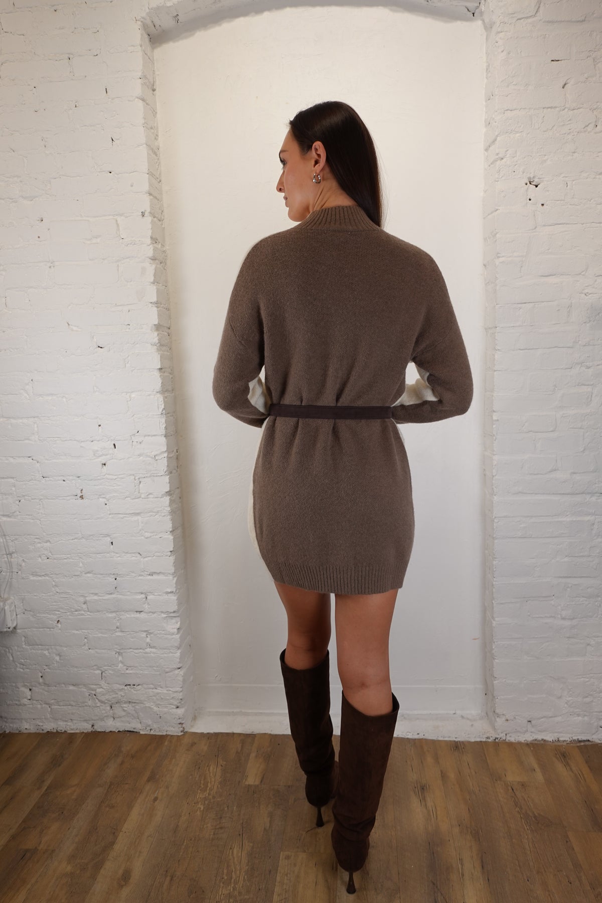 The Gianna Colorblock Mock Neck Sweater Mini Dress is your new go-to for effortless style. This playful piece features a chic cream front paired with a sophisticated taupe back, creating a modern colorblock effect that's anything but boring. The cozy mock neck keeps things polished while the mini length shows off your legs. Perfect for layering over tights or rocking solo, this dress transitions seamlessly from casual coffee runs to weekend hangouts. Comfort meets personality in one seriously cute package.