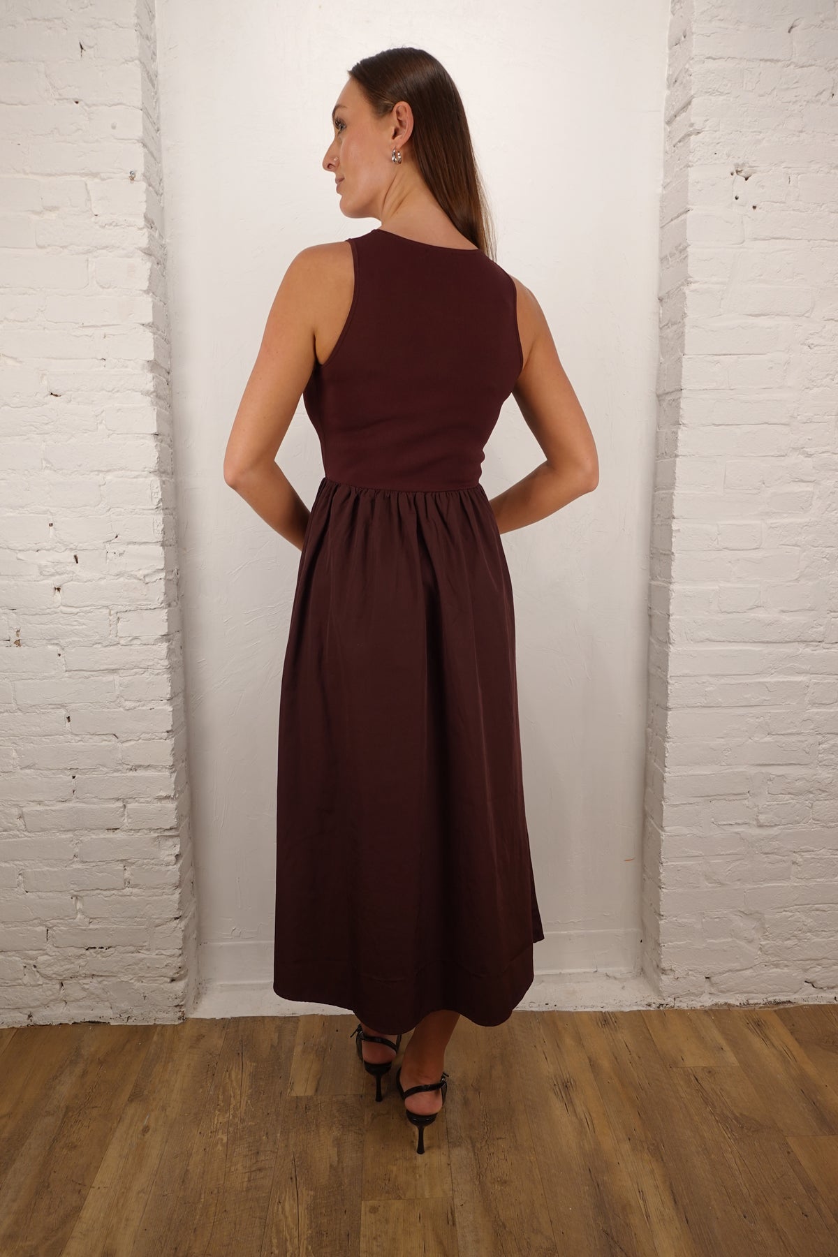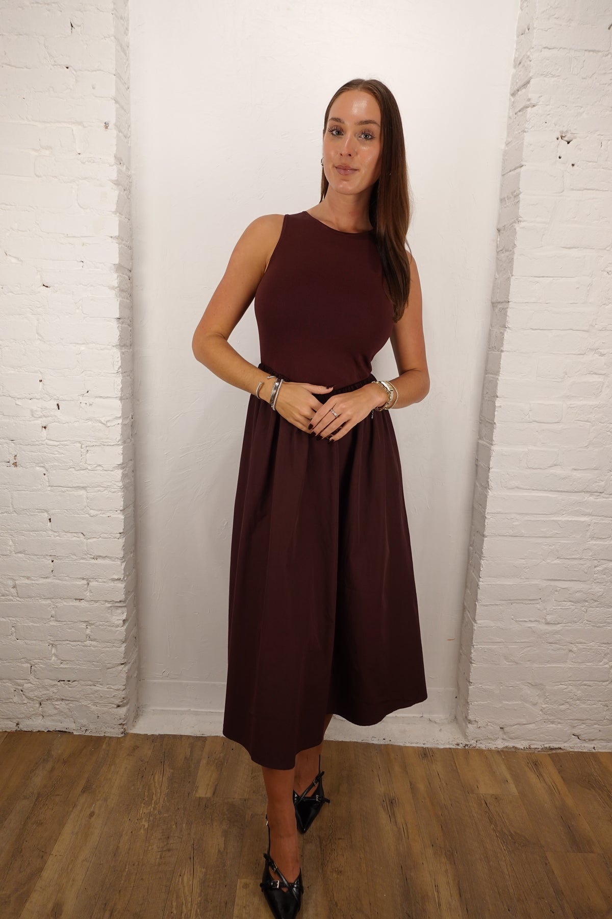 Turn heads in the Meg Mixed Media Midi Dress, featuring a cozy ribbed sleeveless top that hugs you just right and a flowy bottom that dances with every step. Its deep red hue adds a pop of playful elegance, making it perfect for day-to-night fun. Comfortable, stylish, and effortlessly flirty—this dress is ready to keep up with your every move!