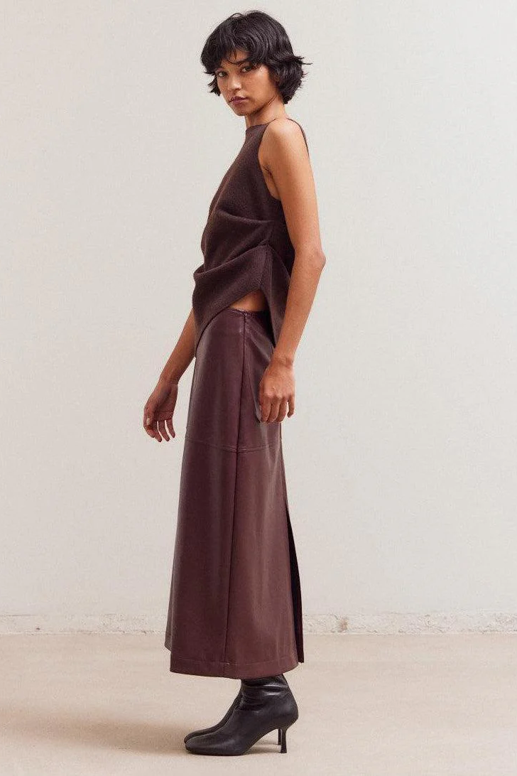 The Nancy Unbalanced Side Knit Top is your new go-to for effortless edge. This sleeveless knit features playful side shirring that creates an asymmetrical silhouette—perfect for adding visual interest to any outfit. Crafted in rich dark chocolate brown, it's versatile enough to dress up or down. Layer it over a crisp white shirt, pair with your favorite jeans, or wear solo for a statement look. A modern twist on classic knitwear that keeps things fun and unexpected.