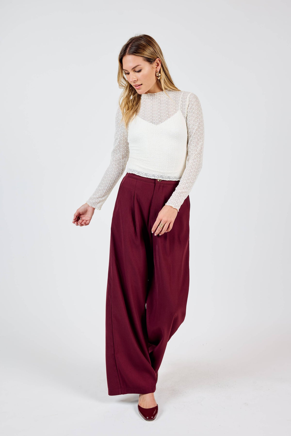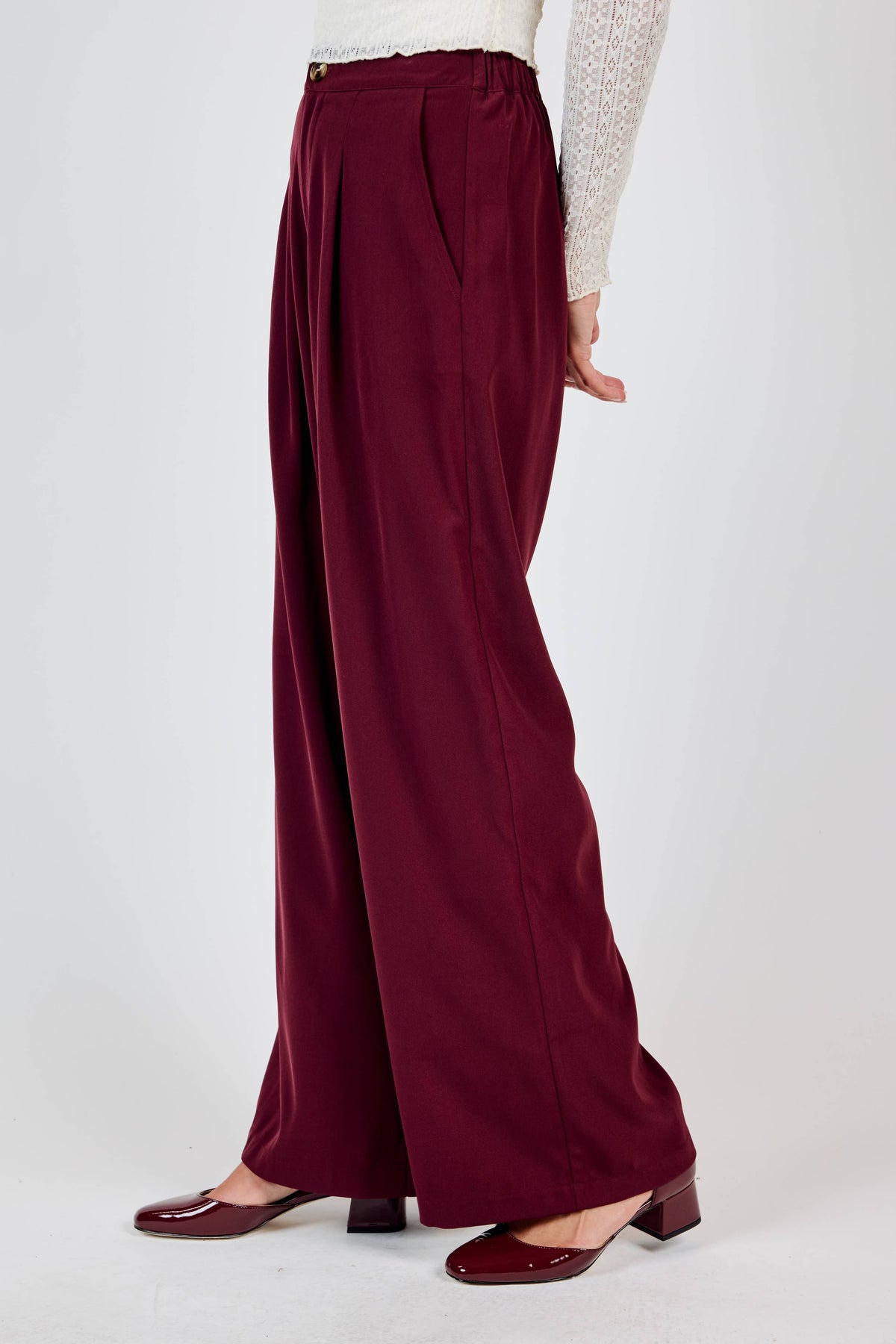 Elevate your wardrobe with the Stacy Wide Leg Pleated Pants in rich burgundy. These statement trousers feature sharp pleats down the front for a polished, vintage-inspired silhouette that commands attention. The generous wide-leg cut offers comfort without sacrificing style, making them perfect for dressing up or down. Whether you're heading to the office or a night out, these burgundy beauties deliver effortless sophistication with a fun twist.