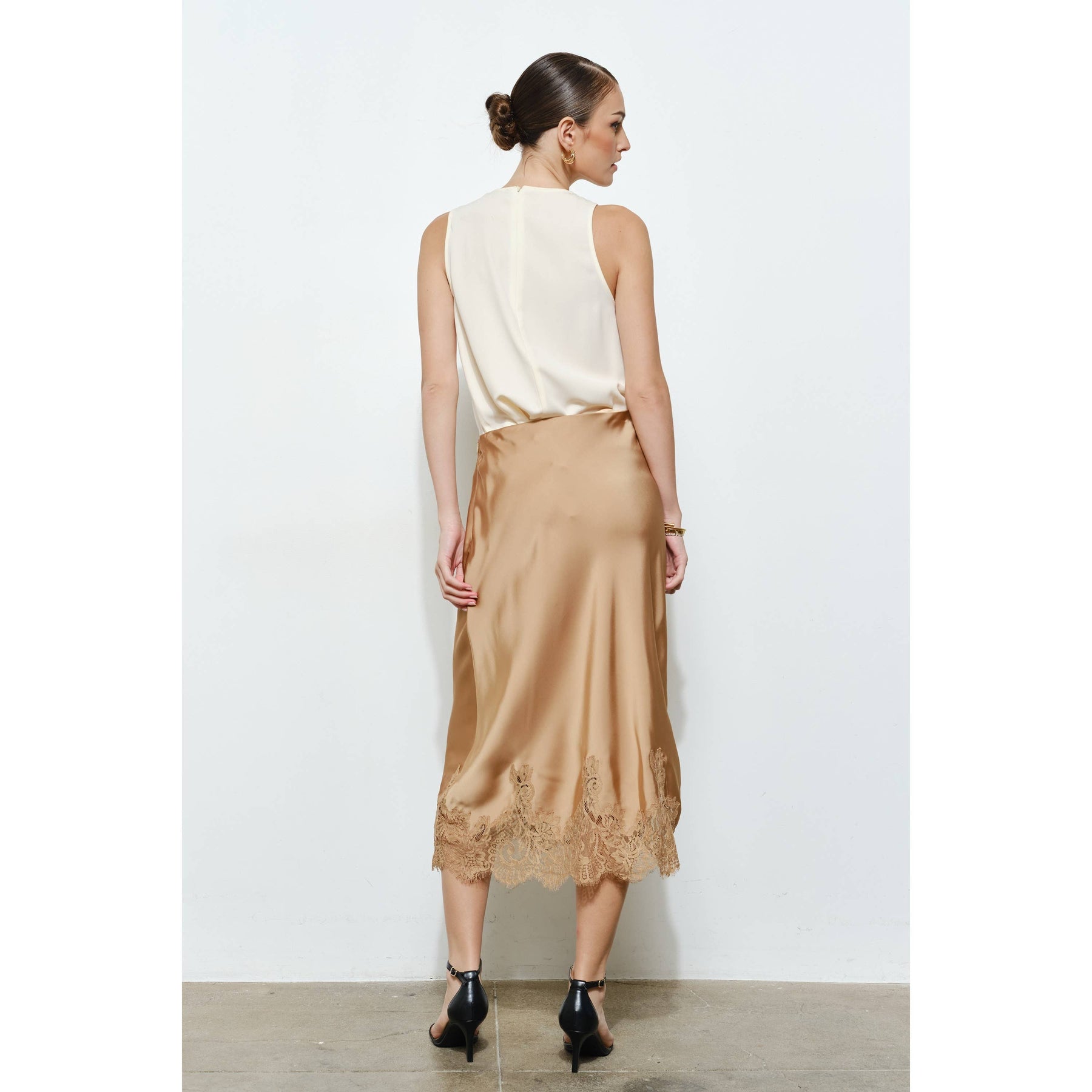 Classic Silky with Lace Hem Contrast H-Line Midi Skirt -Elegant silky lace hem skirt -Contrast lace midi skirt -Chic H-line office skirt -Silky lace trim midi skirt -Classic feminine lace skirt -Model is 5'9.5" and is wearing a size small SELF:100%POLYESTER