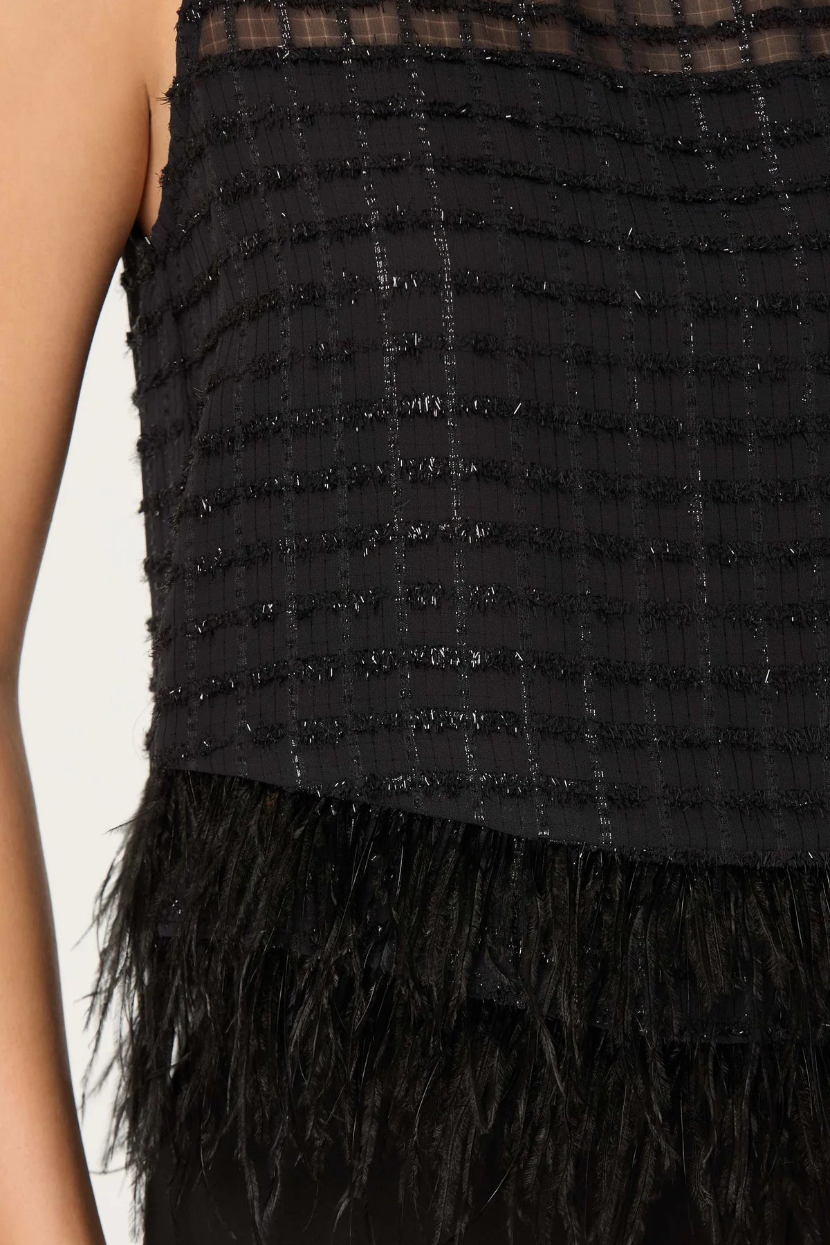 • Metallic feather trim top