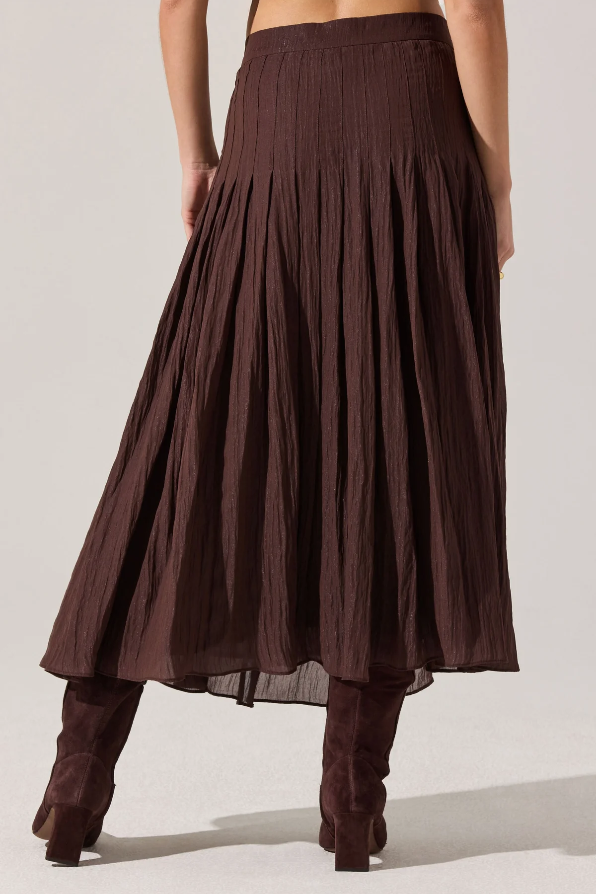 Add a touch of shimmer to your day with the Daivini Pleated Crinkle Midi Skirt. This brown skirt dazzles with vertical pleats and a subtle metallic sheen that catches the light just right. Fully lined for comfort and featuring a discreet side zipper and hook & eye closure, it’s easy to wear and style. Perfect for twirling through your day with playful elegance. Made from soft, durable polyester that moves with you!