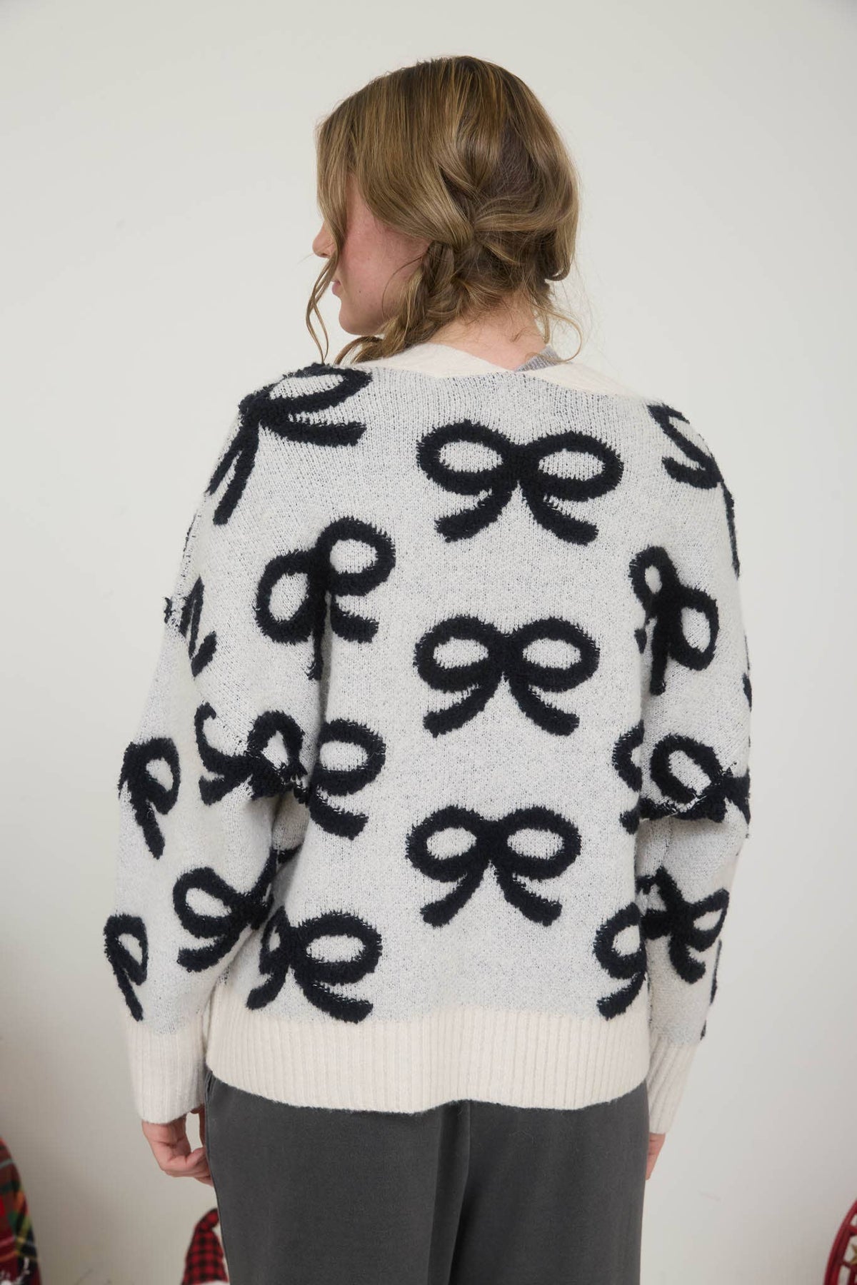 Elevate your everyday style with this charming cardigan featuring an adorable black bow print against a crisp white backdrop. Perfect for layering over dresses, tees, or tanks, this piece brings a touch of whimsy and sophistication to any outfit. The playful bow motif adds personality while the classic color combo keeps it versatile enough for year-round wear. Whether you're dressing up for brunch or keeping it casual, this cardigan is your go-to for effortless charm.