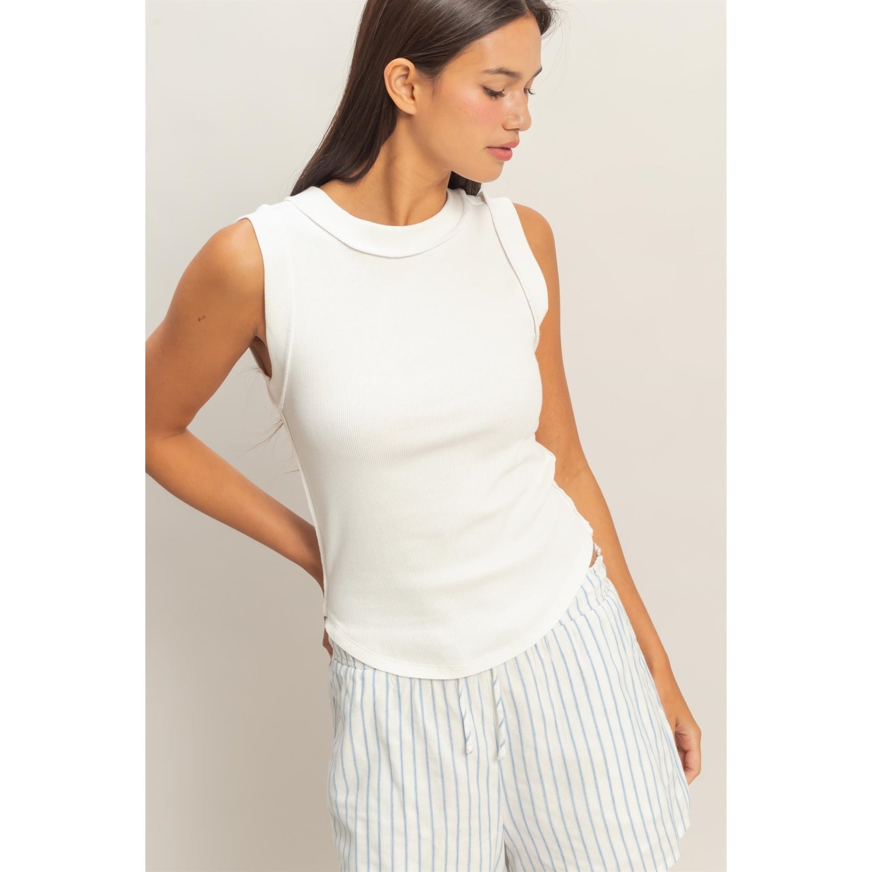 Crafted from soft cotton-spandex ribbed knit, this foundational tank top offers comfortable stretch and texture. The design features a classic, high ribbed crew neckline and raw edge finish ribbed trim at the edges. Cut in a snug fit, the hemline is finished with a subtle curved shape. Pair with a denim skirt for a casual day out.